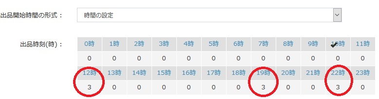 上記の設定ですと、12時、19時、22時に3品ずつ出品されます。