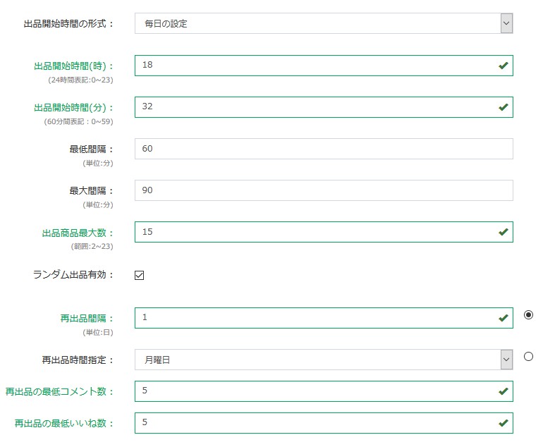 自動出品が開始される時間となります。上記の設定ですと18時32分に商品登録順(降順)に出品されます。